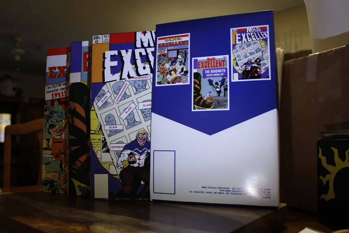 For a school project, I created a comic book character and came up with a design for a comic or graphic novel collection case that would showcase this character over a multi-decade lifespan of published work. I wanted each volume to have the feel of an “era” of comic history and created “homage” covers for this character after iconic existing designs.