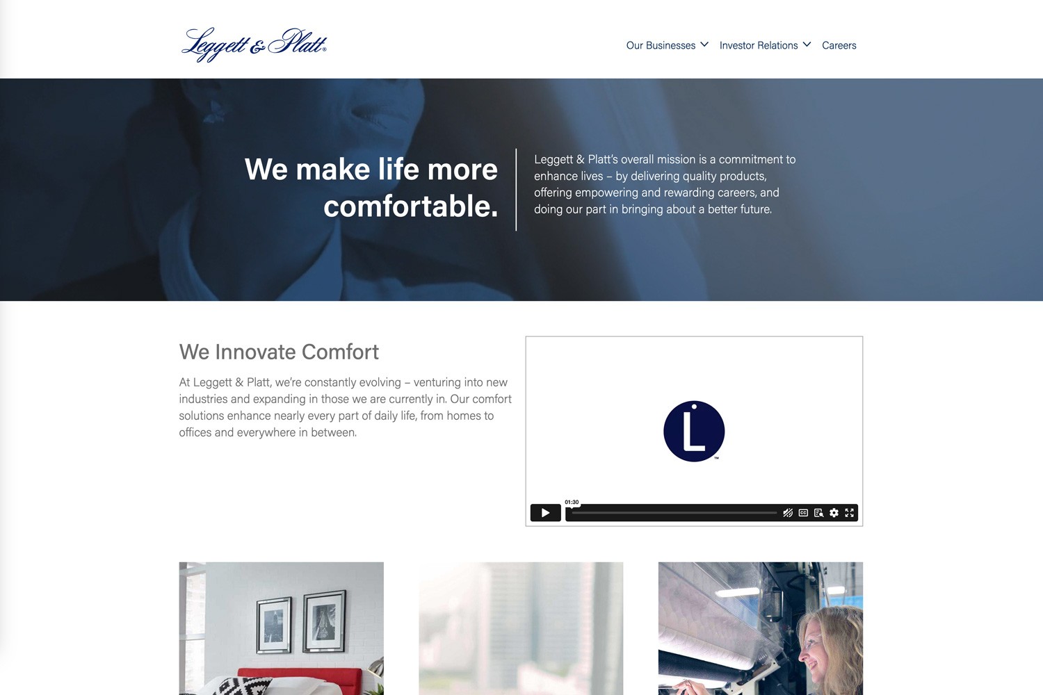 Leggett & Platt is a very large company with over 19,000 employees and business interests in multiple fields. Our biggest challenge was to effectively represent the hierarchy that existed internally in the company to outsiders or potential customers, as well as providing useful functionality for existing employees and partners. Working with the L&P management team, we iterated through several ideas about divisional hierarchy before ending on what exists currently.