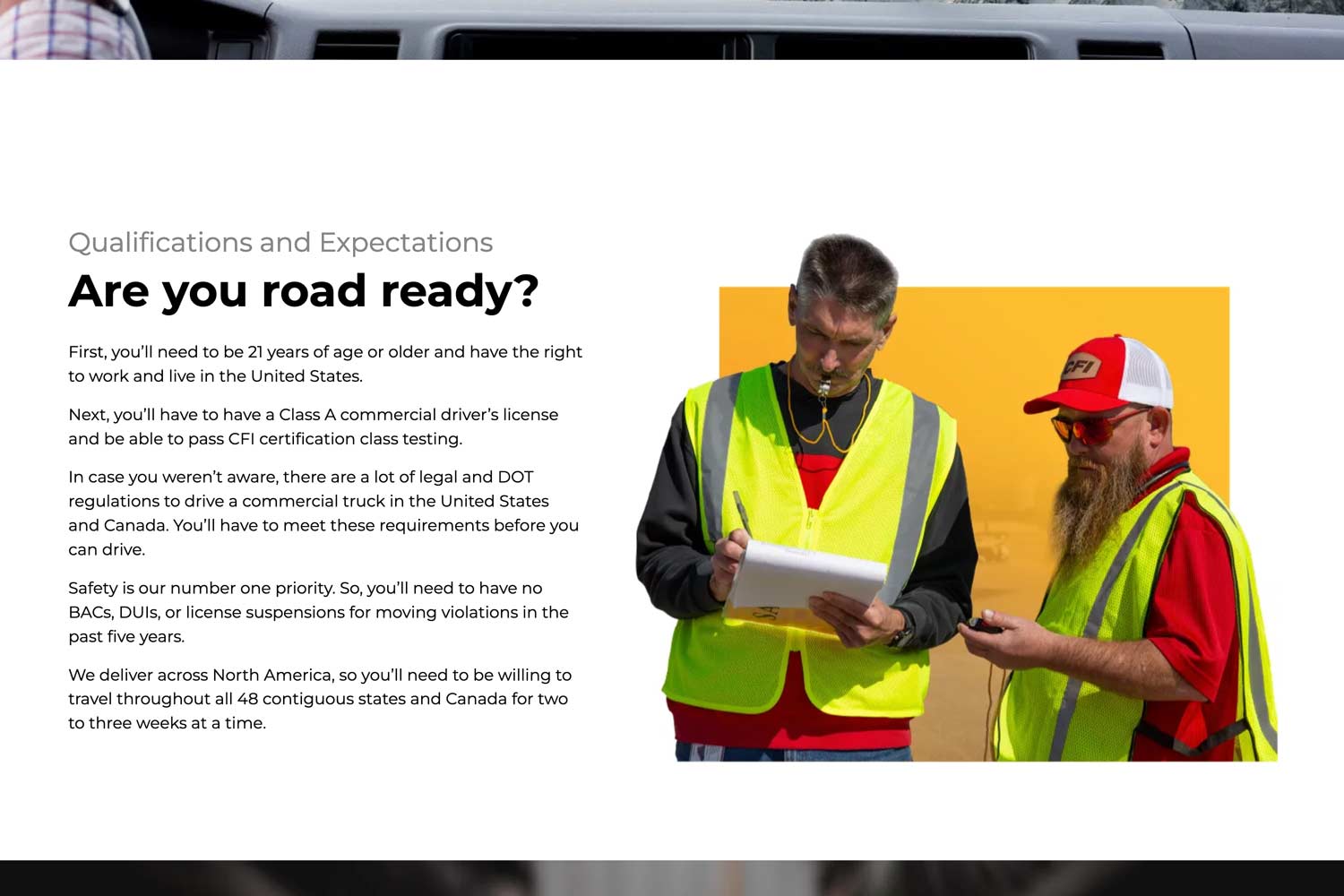 The client expressed to us that drivers were seemingly not being enticed to apply or request information, despite things like benefits and pay being comparable to peer sites. Our solution enhanced the visual appeal of the site with better imagery and additional videos featuring things like testimonials and interviews. We added copy that was more conversational and descriptive in place of bulleted lists. We also reorganized the categories of the site to better reflect the client’s revised hierarchy of informational priority.