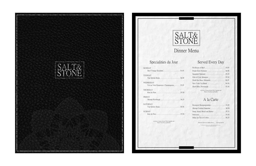 Salt & Stone was an exercise in brand identity and applied branding taken from Reddit as inspiration for creating some design pieces. The challenge given was to create a brand and logo for an upscale restaurant and apply that brand to a functional design piece. I chose a menu.